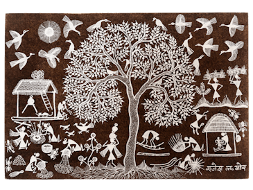 1982年、インド・マハラシュトラ州・ガンジャード村生まれ。先住民ワルリ族。祖母からワルリ画を学び、以来30年以上にわたり制作。祖父、父が「バガット」というシャーマンの家系。植物をこよなく愛し、草木、樹木とともにあるワルリ族の暮らしや、物語を繊細な筆致で表現する。